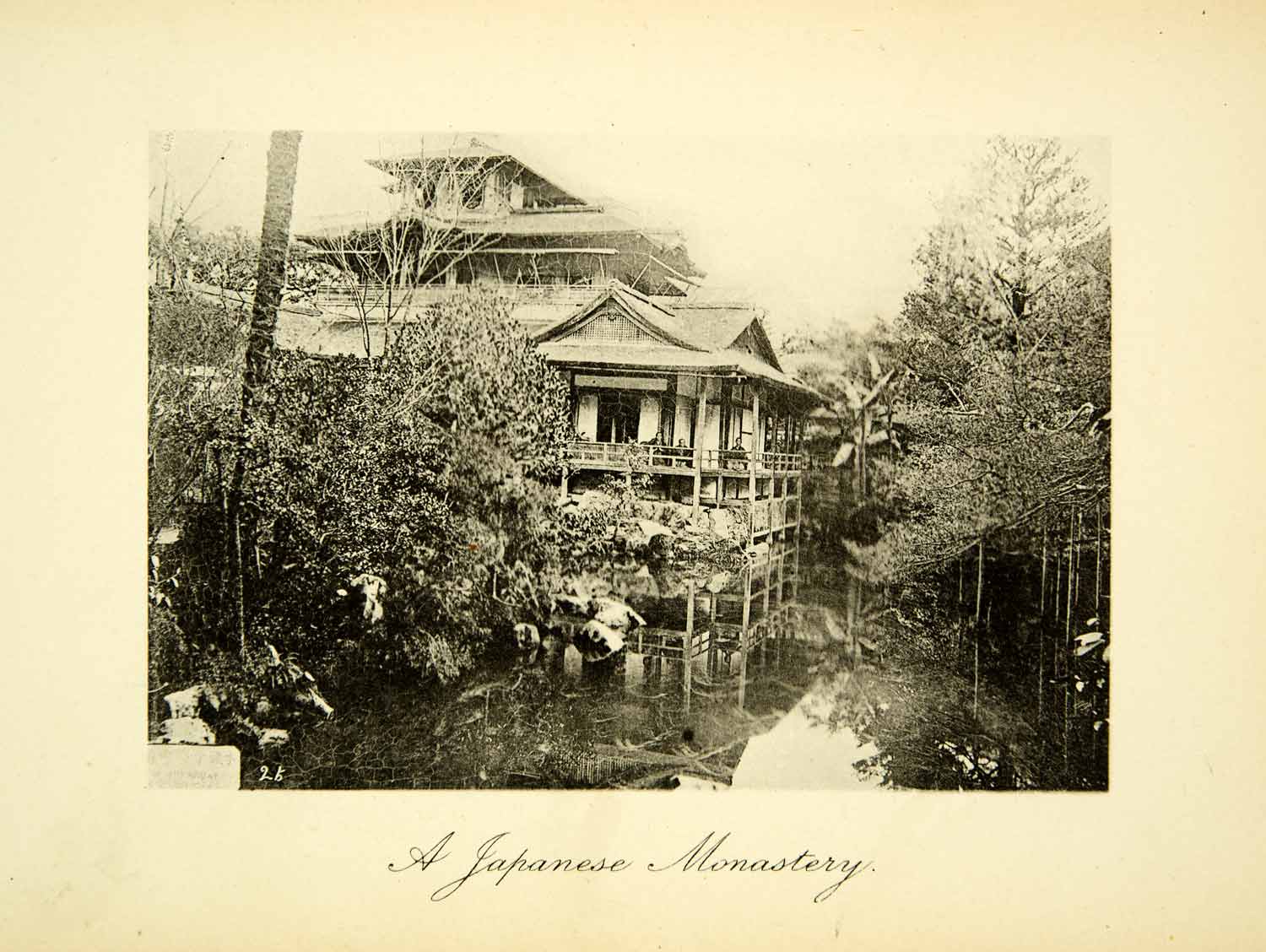 This is an original 1893 black and white photogravure of a traditional Japanese monastery, secluded on one side by a peaceful lake.