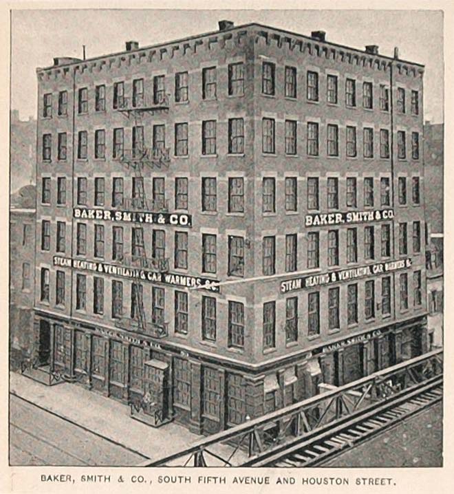 This is an original 1893 halftone print of the Baker Smith & Company Building, South Fifth Avenue and Houston Street, New York City.