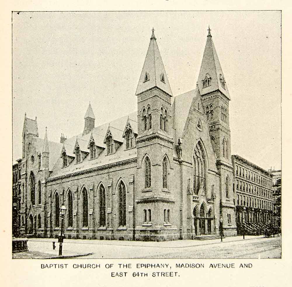 This is an original 1893 black and white halftone print of the Baptist Church of the Epiphany at 723 Madison Avenue and East 64th Street in New York City.