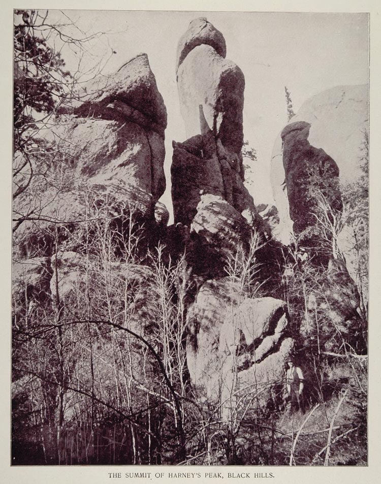 This is an original 1893 halftone print of the summit of Harney Peak in the Black Hills, the highest mountain in South Dakota. (Please note that there is printing on the reverse.)
