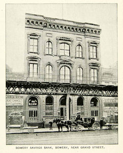 This is an original 1893 black and white halftone print of the Bowery Savings Bank building in the Bowery near Grand Street in New York City.