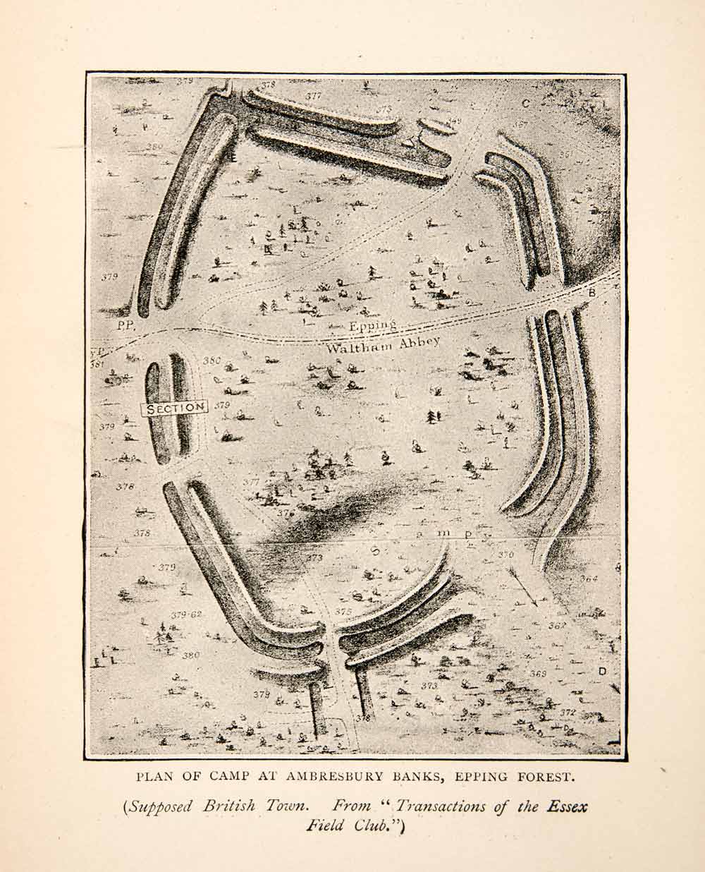 This is an original 1893 black and white halftone print of the plan of the camp at Ambresbury Banks in Epping Forest in England.