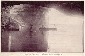 This is an original 1893 halftone print of a boat in the Cave of the Dark Waters on Lake Superior. (Please note that there is printing on the reverse.)