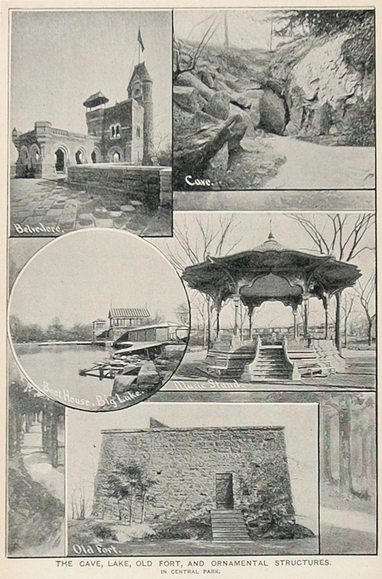 This is an original 1893 halftone print of scenes in New York City's Central Park including: Belvedere, the Cave, the Boat House on Big Lake, the Music Stand, and the Old Fort.