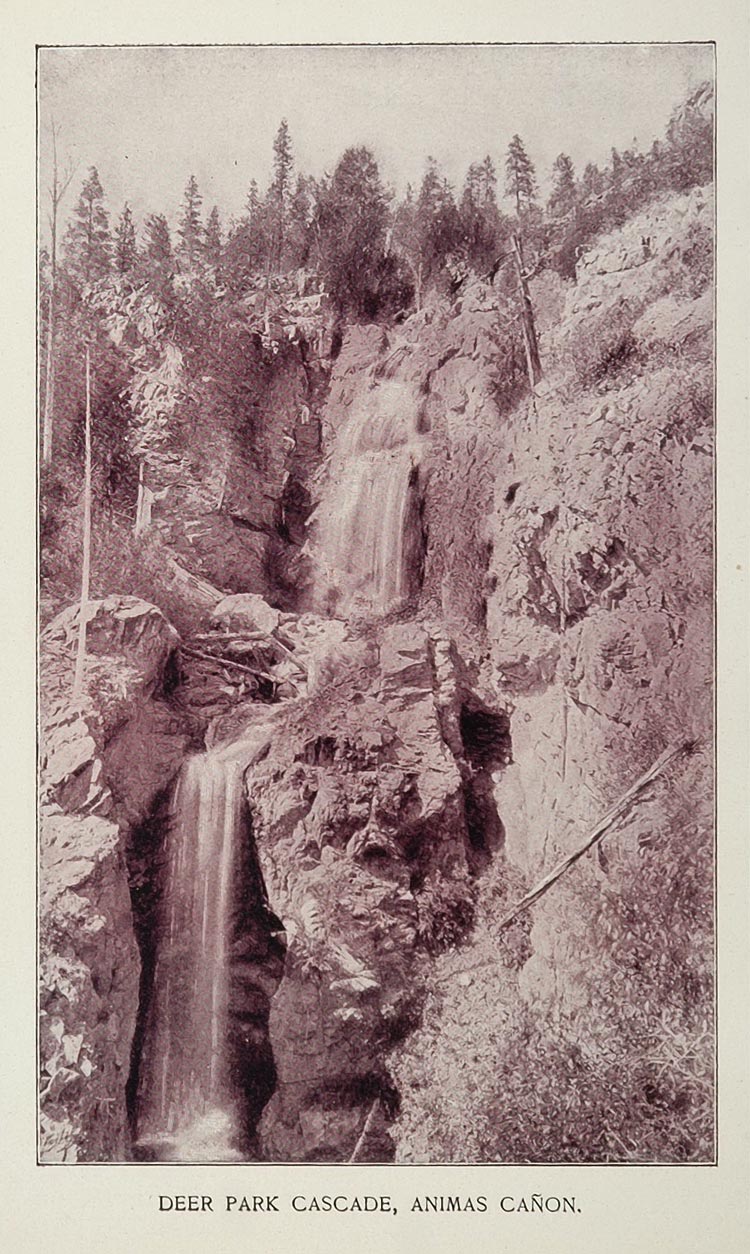 This is an original 1893 duotone print of Deer Park Cascade or waterfall in Animas Canyon, Colorado.