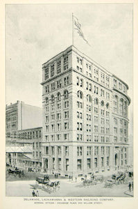 This is an original 1893 black and white halftone print of a sketch of the office building of the Delaware, Lackawanna & Western Railroad Company in New York City.