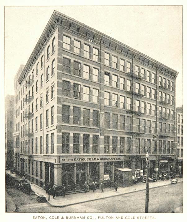 This is an original 1893 halftone print of the Eaton, Cole & Burnham Co. Building, Fulton and Gold Streets, New York City.