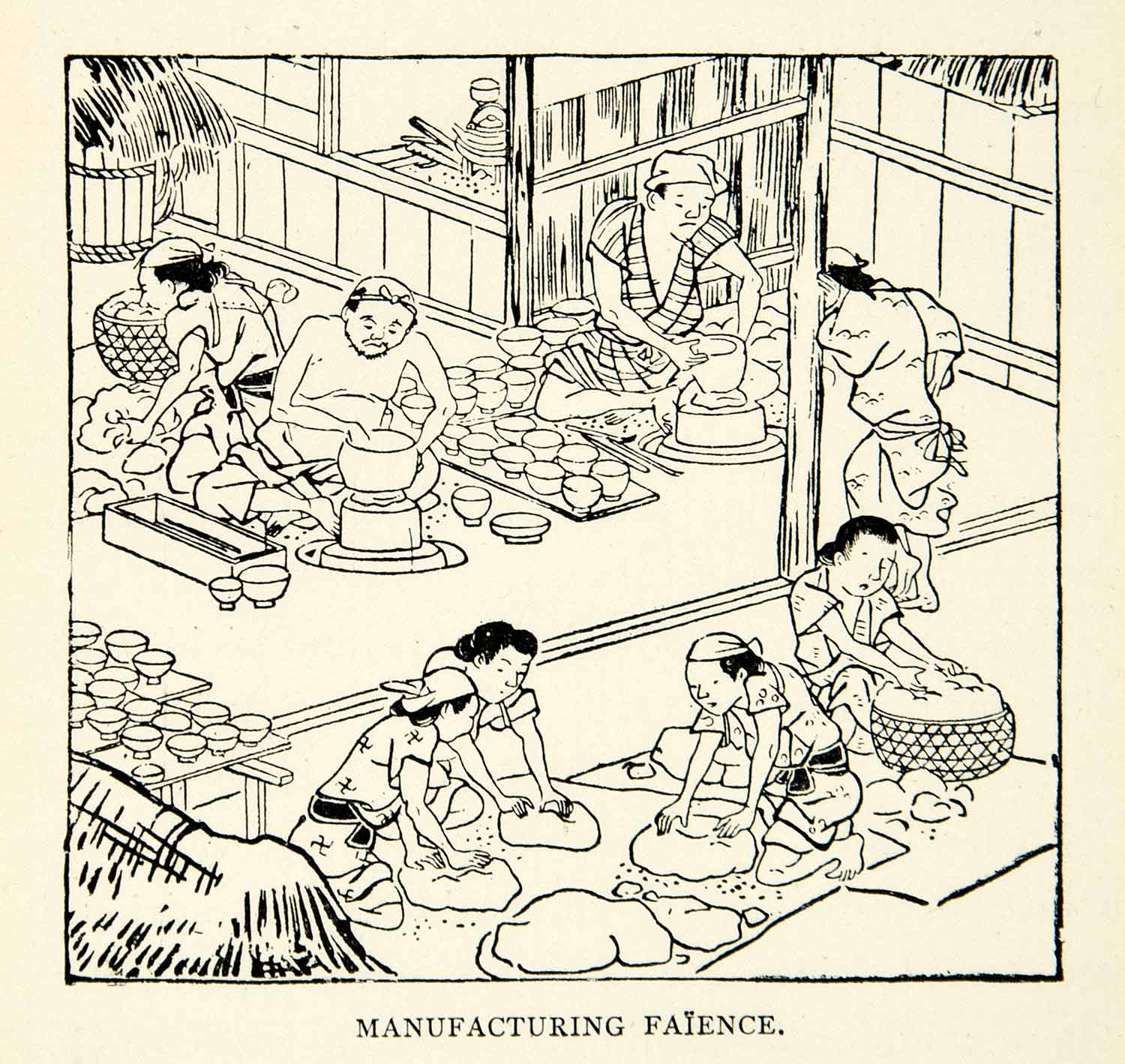 This is an original 1893 monochrome relief line-block print that depicts Japanese workers creating pottery and earthenware pieces.