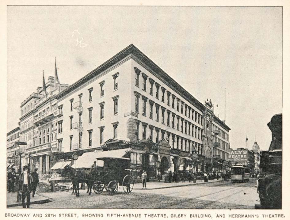 This is an original 1893 halftone print of Broadway and 28th Street, New York City, showing the Fifth Avenue Theatre, Gilsey Building, and Herrmann's Theatre.