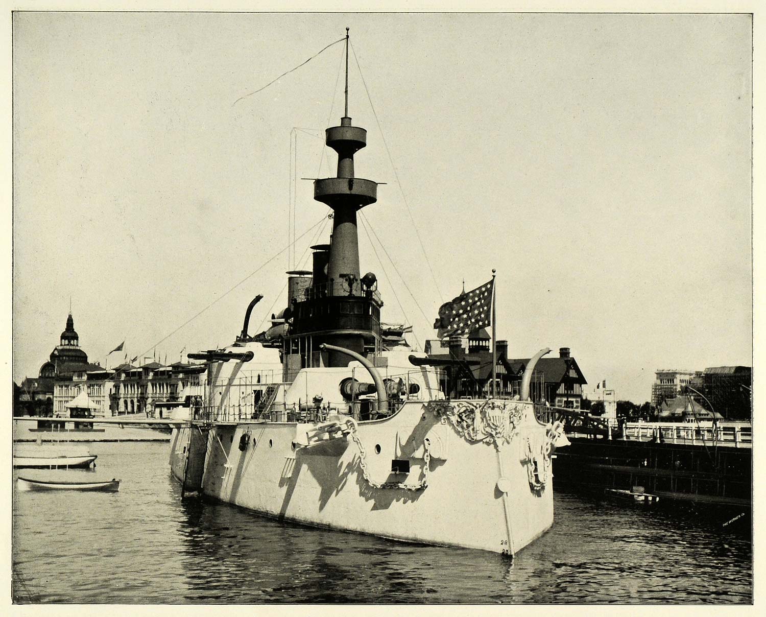 This is an original 1894 halftone print showing the Illinois Battle Ship. This ship is 384 feet long, has an extreme breadth of 69.25 feet, a draught of 24 feet, and weighs 10,231 tons. It also has four 13 inch breech loading rifled cannons, eight 8 inch and four 6 inch of the same. It has twenty 6 pound rapid firing guns and six 1 pound of the same. At the forward end of the ship is a cone shaped tower called the Military Mast with two circular tops for sharpshooters. (Please note that, typical of halftone prints, there is printing on the reverse.)
