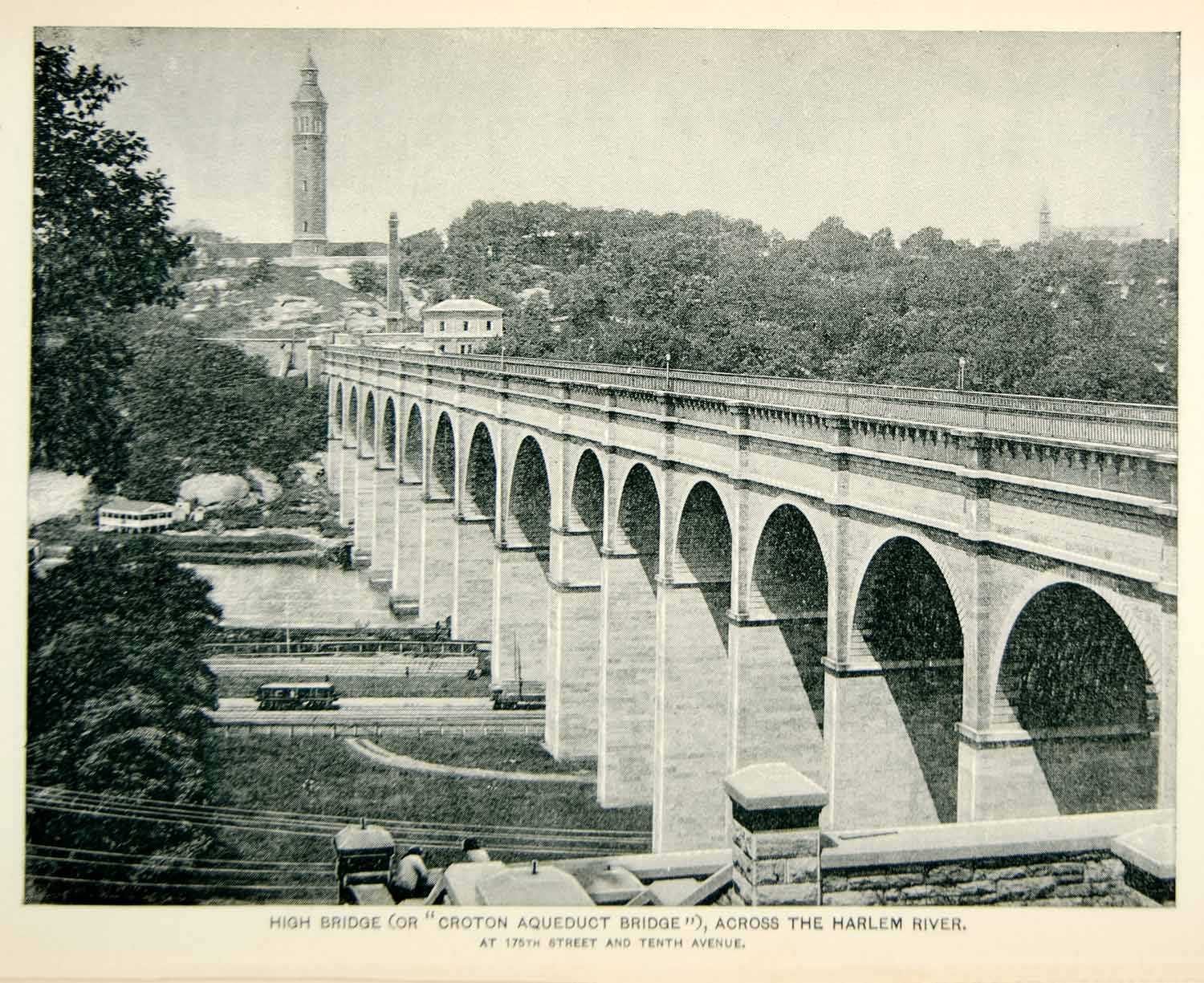 This is an original 1893 black and white halftone print of the High Bridge (or Croton Aqueduct Bridge) over the Harlem River in New York City.