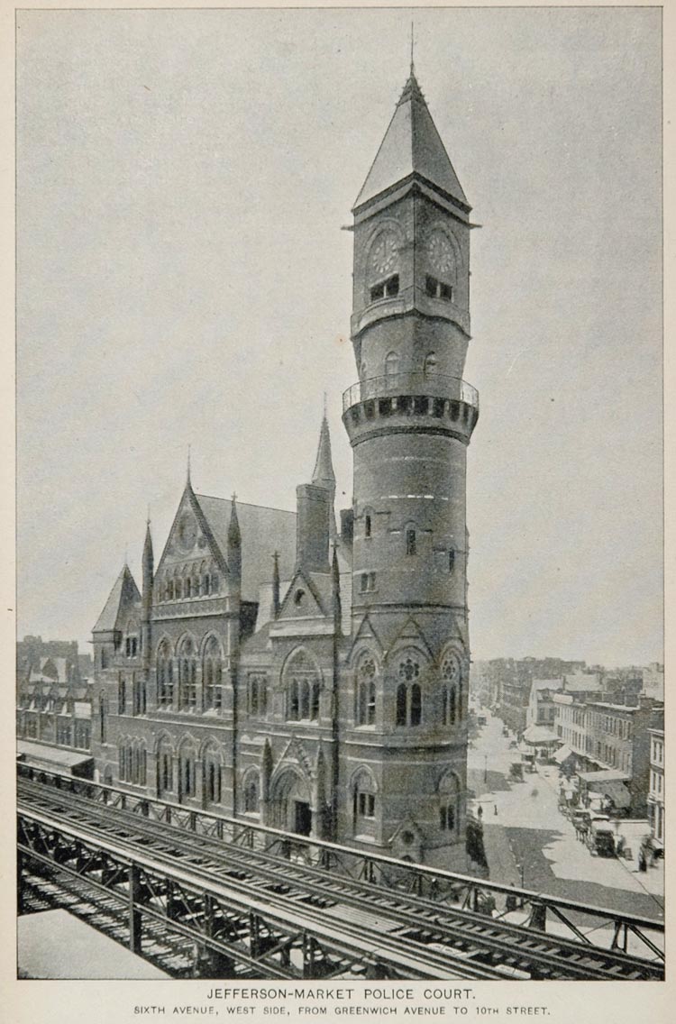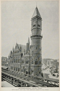 This is an original 1893 halftone print of the Jefferson Market Police Court Building, Sixth Avenue, from Greenwich Avenue to 10th Street, New York City.