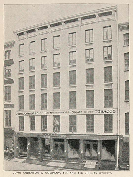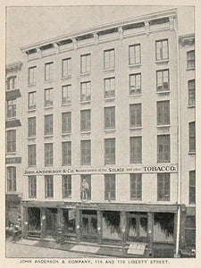 This is an original 1893 halftone print of the John Anderson & Co., Building, manufacturers of the Solace and other Tobacco, 114 and 116 Liberty Street, New York City.
