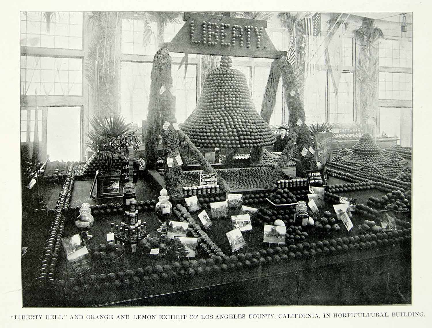 This is an original 1893 black and white halftone print of Los Angeles County's large Liberty Bell of oranges and lemons, which was an exhibit at the World's Columbian Exposition in Chicago.