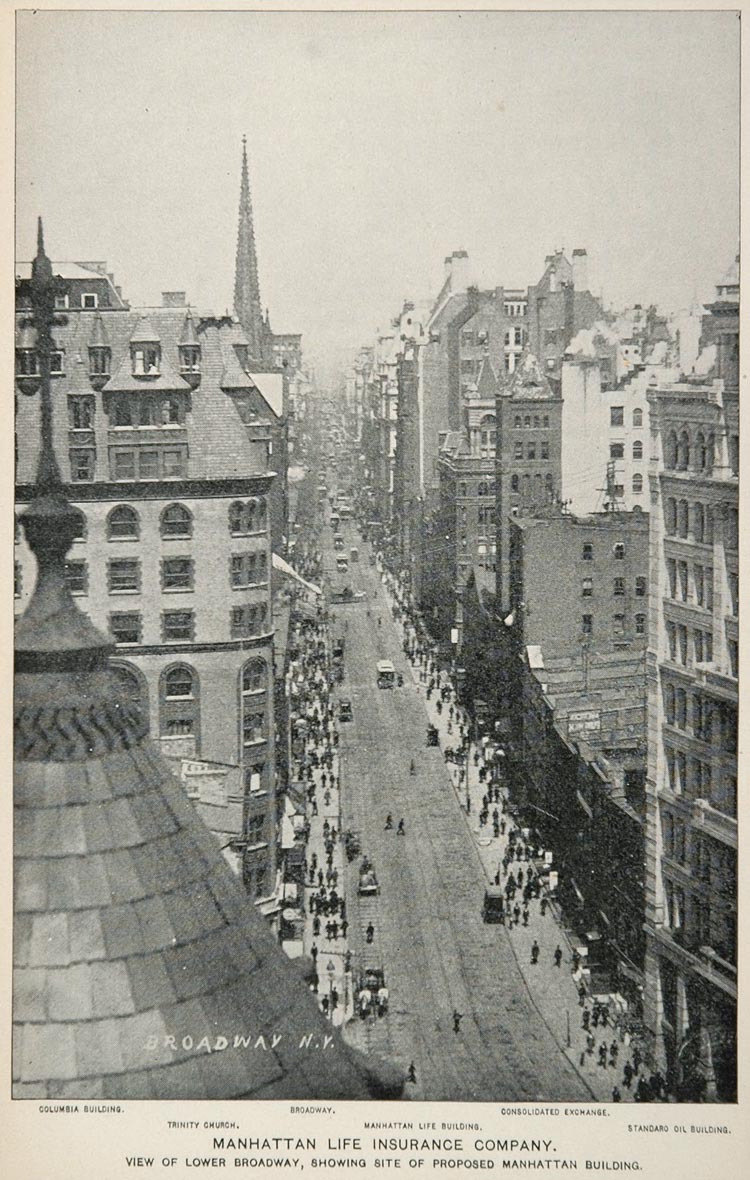 This is an original 1893 halftone print of a view of Lower Broadway in New York City, showing the Columbia Building, Trinity Church, Consolidated Exchange, the Standard Oil Building, and the site of the proposed Manhattan Life Insurance Company Building.