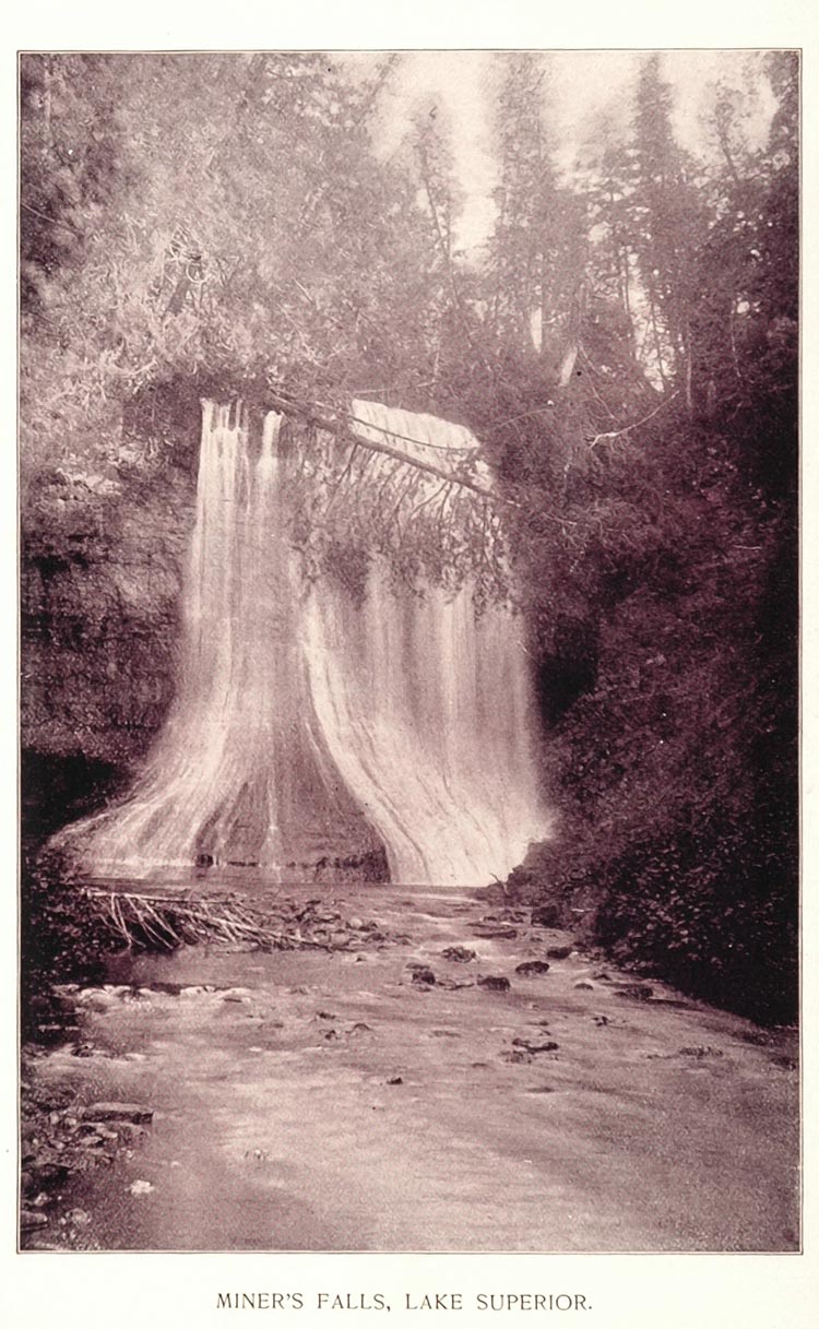 This is an original 1893 duotone print of Miners Falls on Lake Superior in the Pictured Rocks National Lakeshore in Michigan's Upper Peninsula.