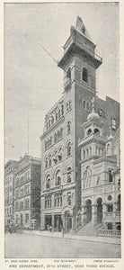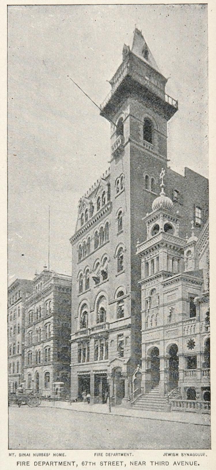 This is an original 1893 halftone print of the New York City Fire Department on 67th Street, near Third Avenue and between the Mt. Sinai Nurses' Home and Jewish Synagogue.