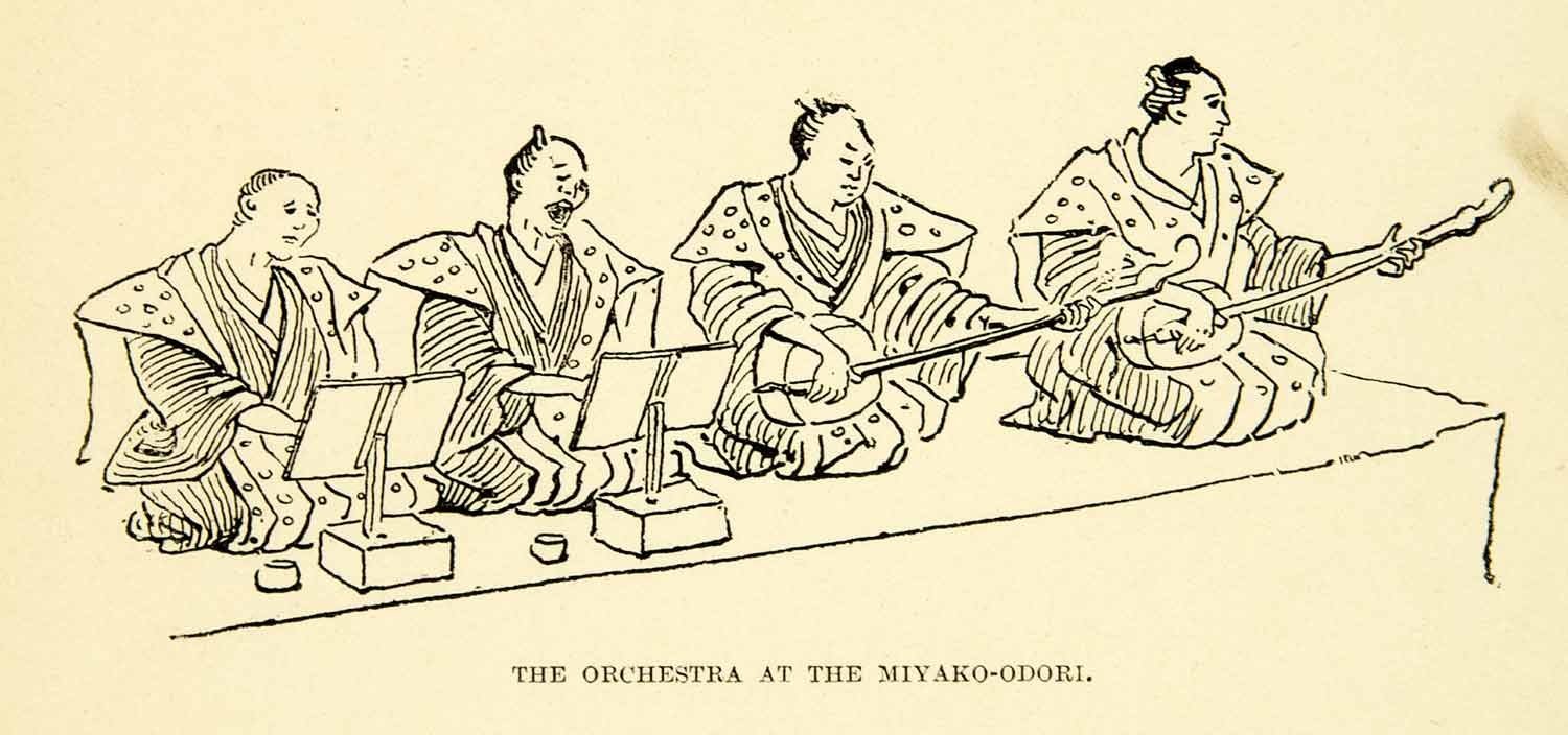 This is an original 1893 black and white relief line-block print of the orchestra at the Miyako Odori (Dance of the Capital) traditionally performed in Kyoto, Japan, at the height of the cherry blossom season.