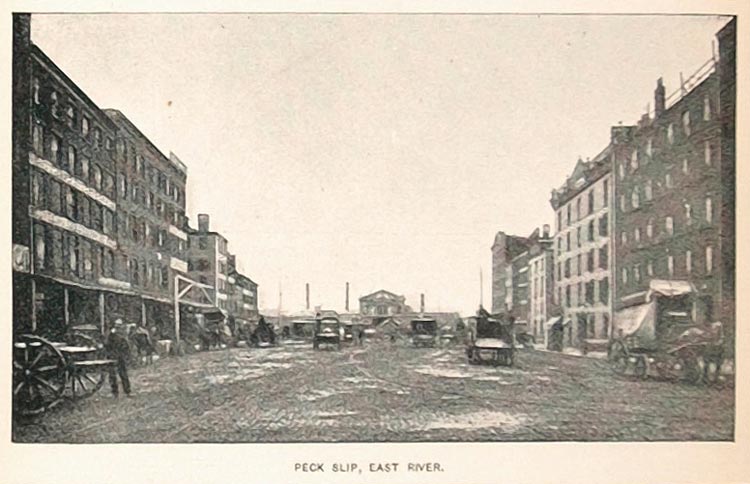 This is an original 1893 halftone print of Peck Slip, East River, New York City.
