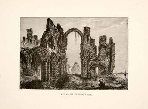 This is an original 1893 black and white relief line-block print of the Ruins of Lindisfarne, England.