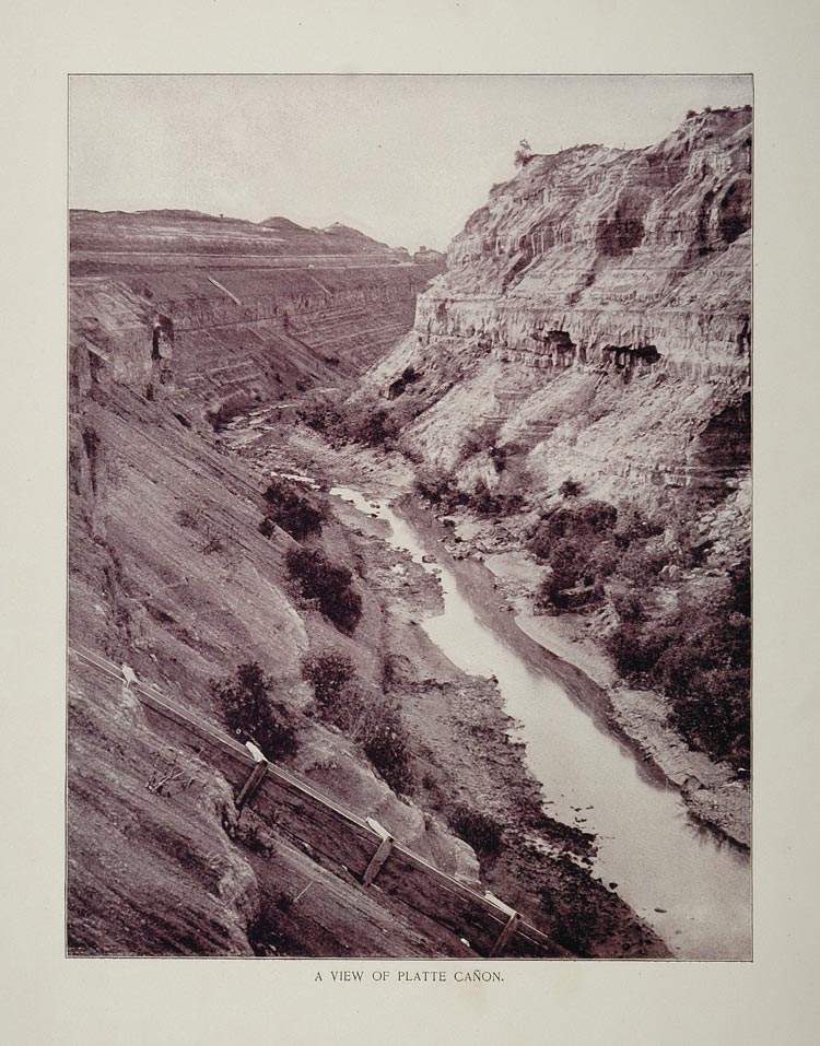This is an original 1893 duotone print of Platte Canyon, a deep narrow gorge on the South Platte River Peak, Colorado.