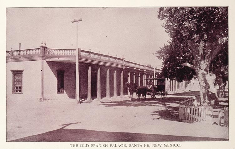 This is an original 1893 duotone print of the Palace of the Governors on the Plaza of Santa Fe, New Mexico.