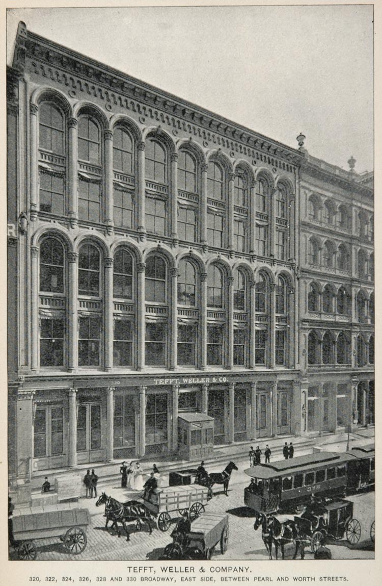 This is an original 1893 halftone print of the Tefft, Weller & Company Building, 320, 322, 326, 328, and 330 Broadway, between Pearl and Worth Streets, New York City.