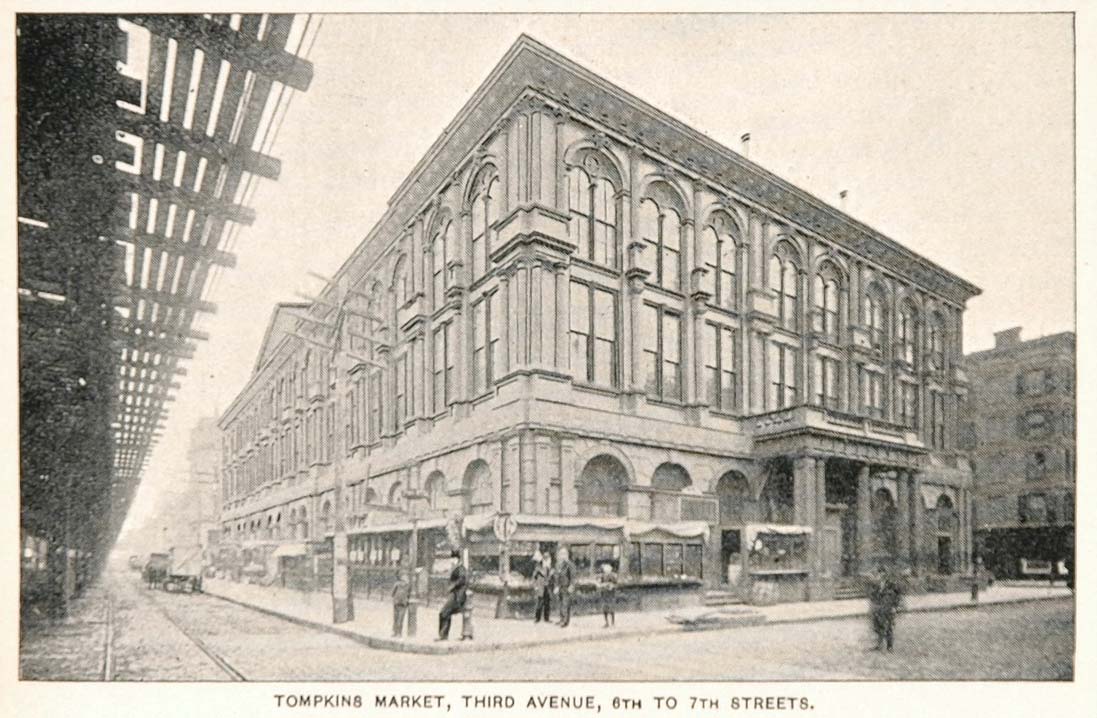 This is an original 1893 halftone print of Tompkins Market, Third Avenue, 6th to 7th Streets, New York City.