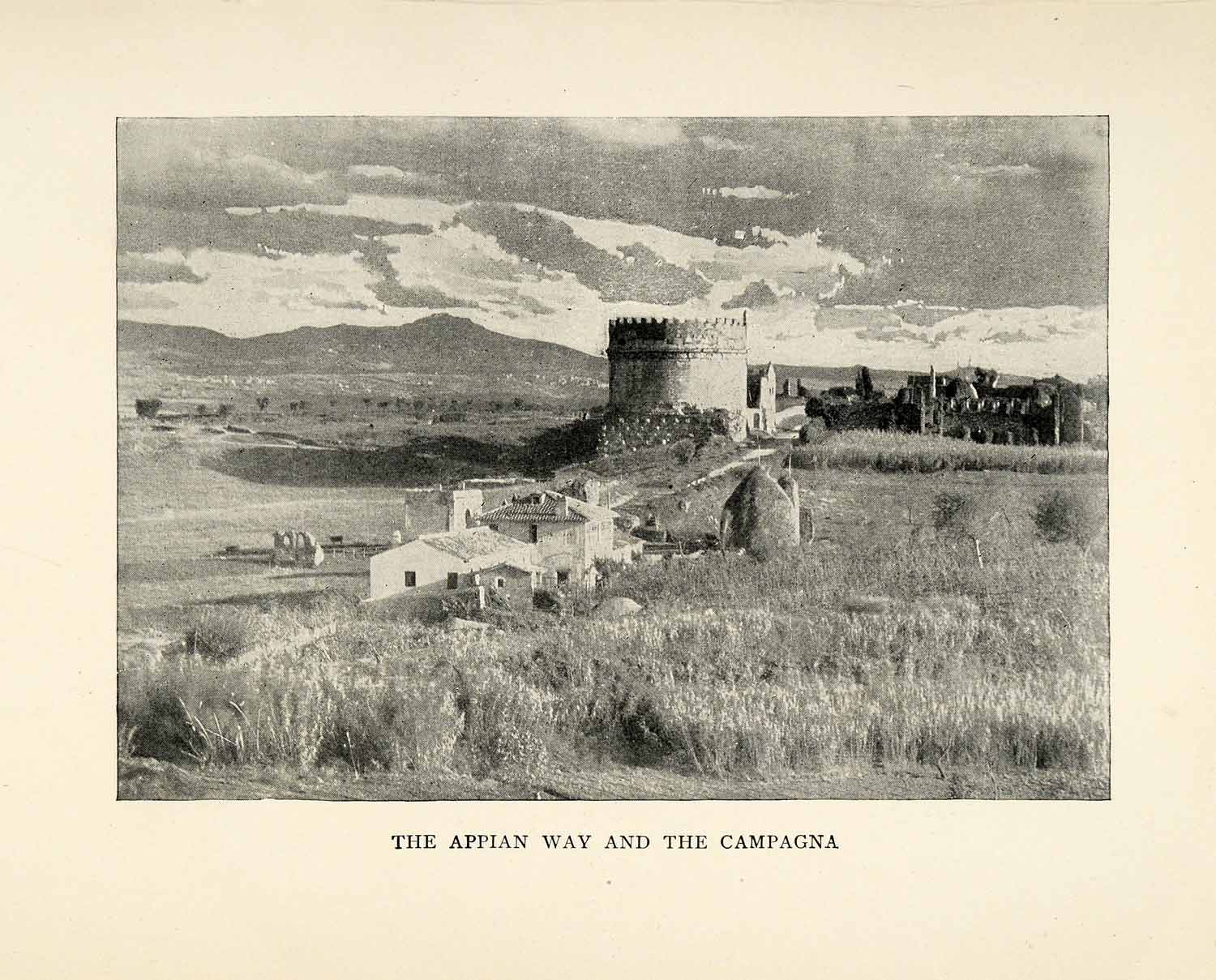 This is an original 1893 halftone print of the Appian Way and the Tomb of Caecilia Metella.