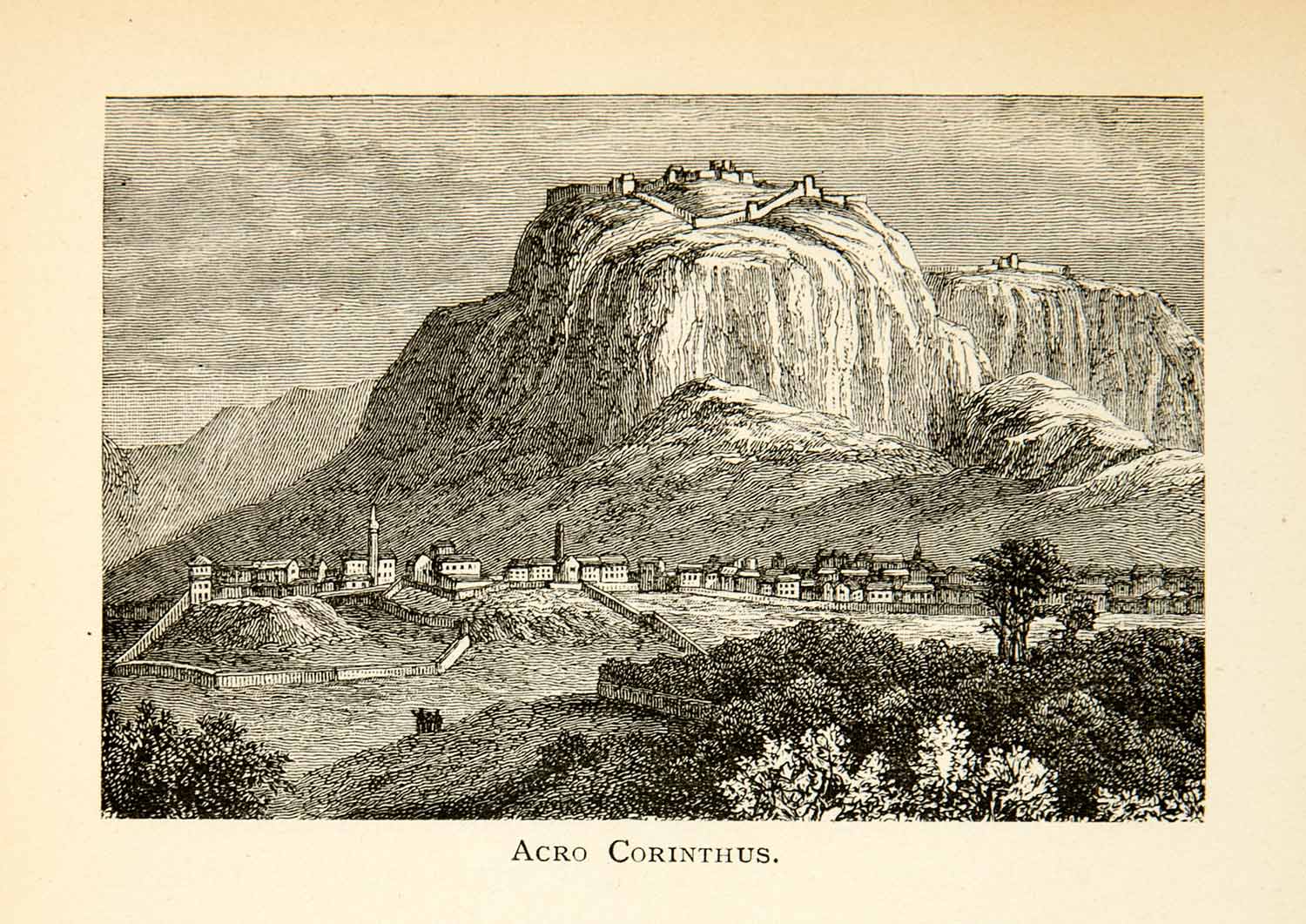 This is an original 1893 black and white in-text wood engraving of Acro Corinthus in Greece.