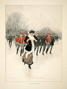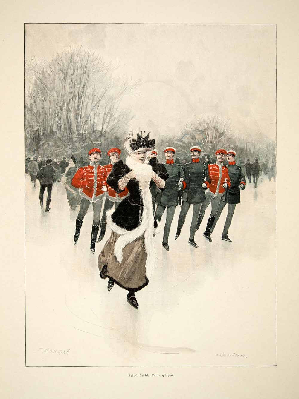 Sauve qui Peut (Every Man for Himself), by Fried Stahl. A pretty young woman ice skates merrily by herself, unaware of the approaching male stampede.