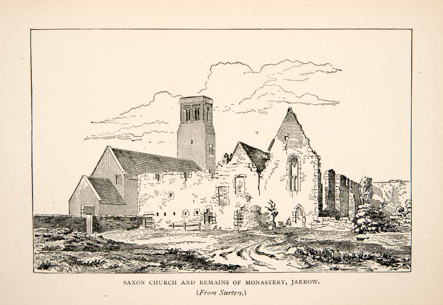 This is an original 1893 black and white wood engraving of the Saxon church and the remains of the monastery in Jarrow, England.