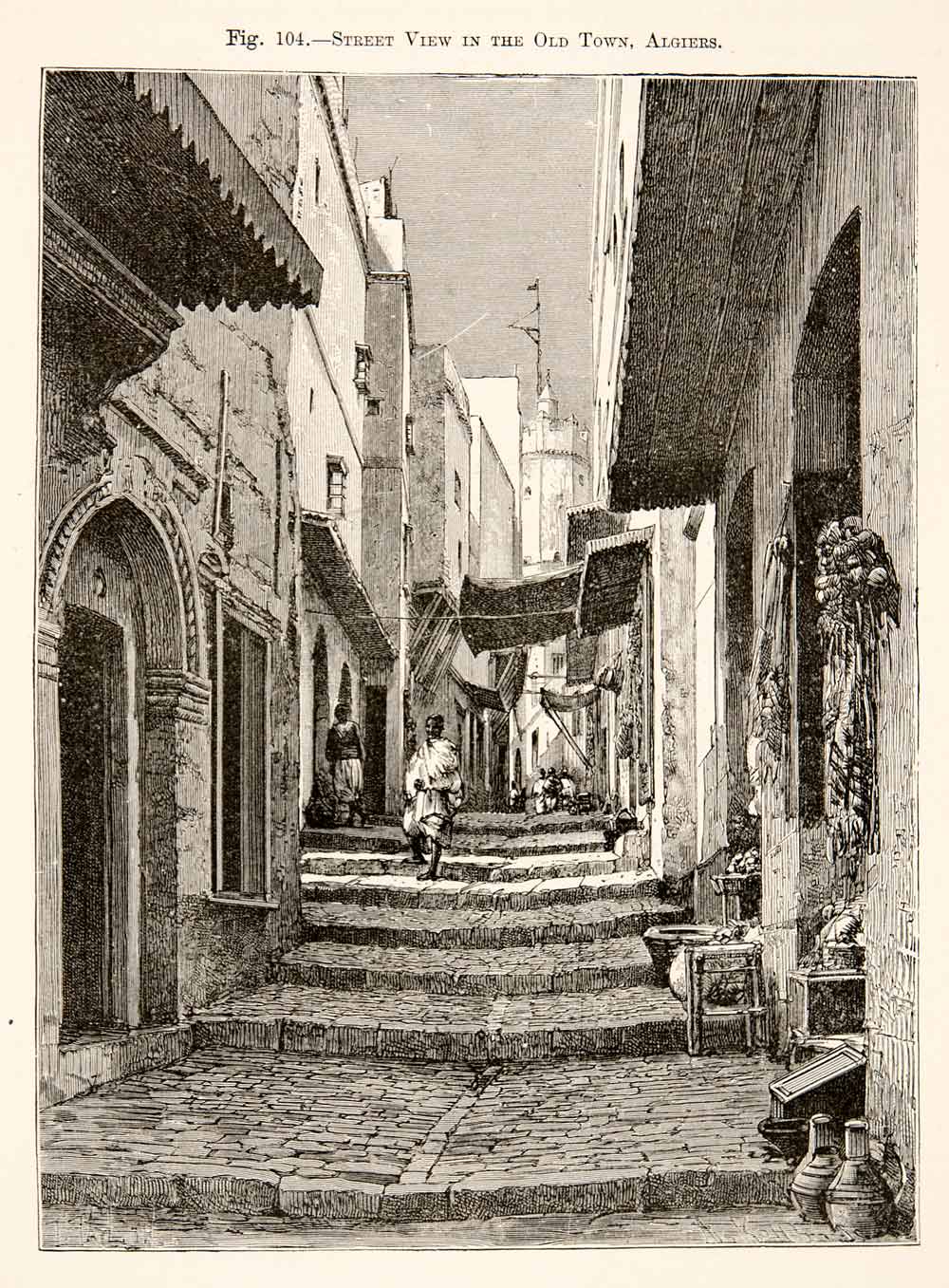 This is an original 1893 black and white in-text wood engraving of a "Street View in the Old Town, Algiers," in Algeria.