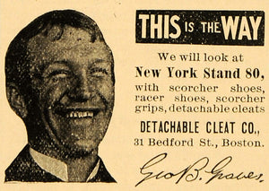 This is a tiny original 1894 black and white print ad for the Detachable Cleat Company of Boston, Massachusetts. The ad writes, "We will look at New York Stand 80, with scorcher shoes, racer shoes, scorcher grips, detachable cleats."
