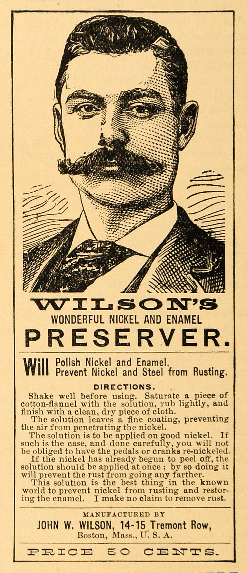 This is a small original 1894 black and white print ad for Wilson's Nickel and Enamel Preserver of Boston, Massachusetts.