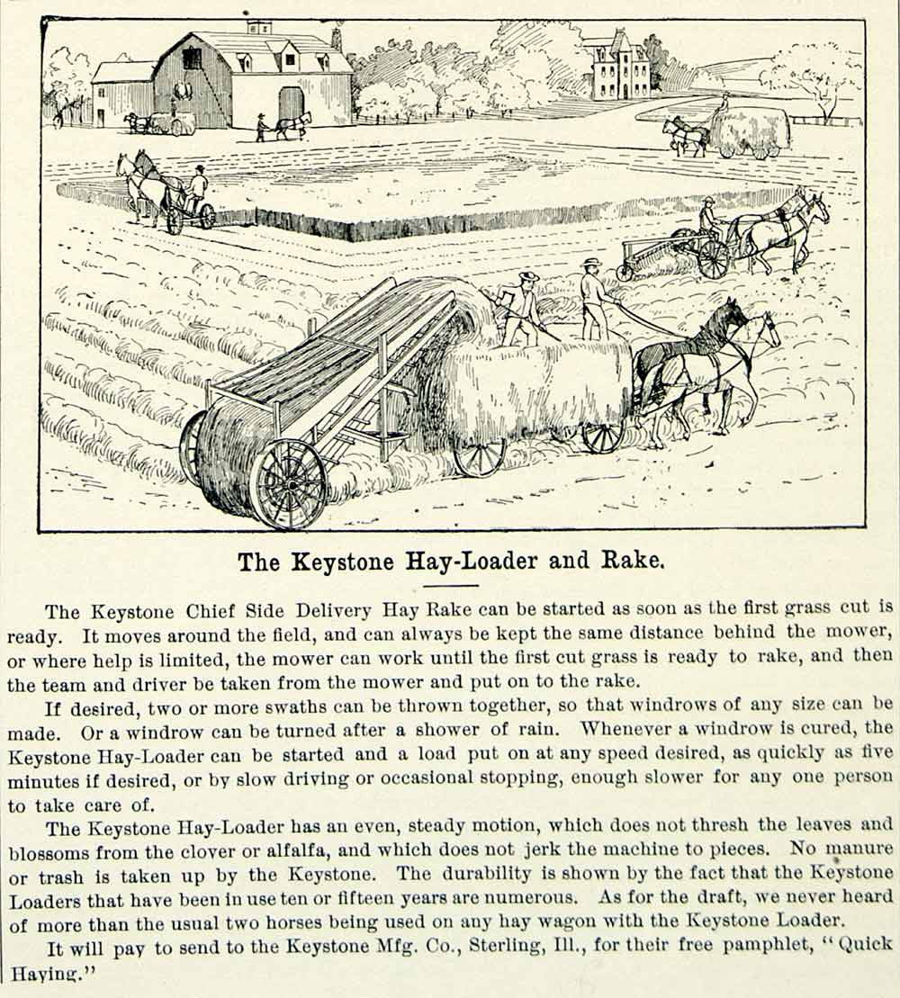 Keywords specific to this image: Antique Advertising, Farming, Agriculture, Agrarian, Work, Labor, Crop, Attachment, Farmer, Tool, Device, Equipment, Machine, Load, Grass Cut, Team, Driver, Livestock, Clover, Alfalfa, Stalk, Manufacturing, Company, Sterling IL, Illinois
