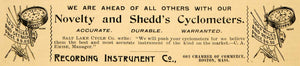 This is an original 1894 black and white print ad for the cyclometers from the Recording Instrument Company of Boston, Massachusetts. The ad features a testimonial from the Salt Lake Cycle Company.