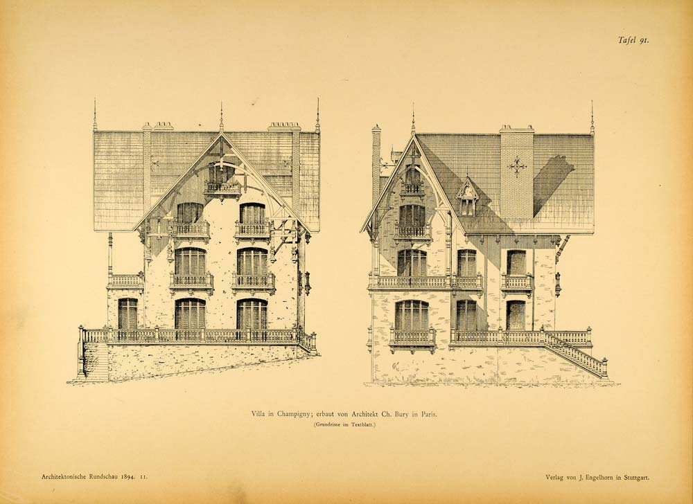This is an original 1894 halftone print of an architectural sketch of a house in Champigny-sur-Marne, France. Architect: Ch. Bury.
