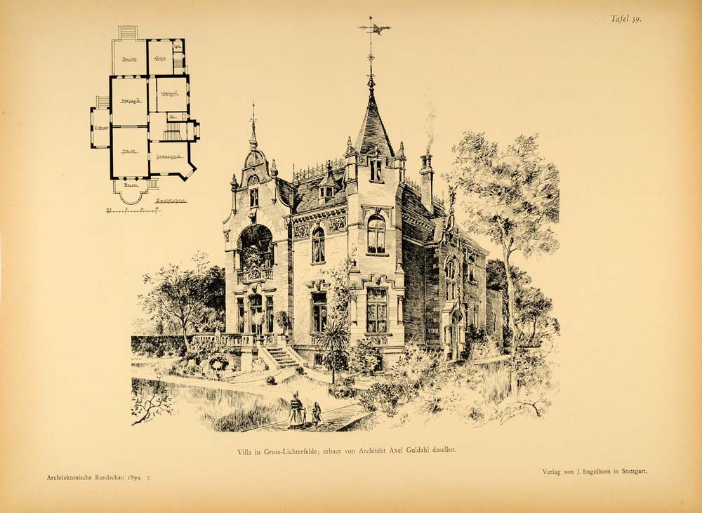 This is an original 1894 halftone print of an architectural sketch of a mansion, with the first floor plan, in the Gross-Lichterfelde section of Berlin, Germany. Architect: Axel Guldahl.