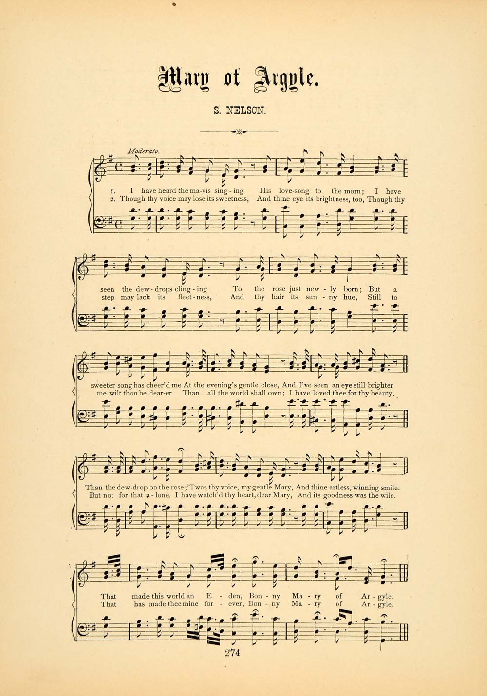This is an original 1894 halftone print of sheet music for "Mary of Argyle," a song written by Charles Jefferys and composed by Sydney Nelson. It is a Scottish love song.CONDITION