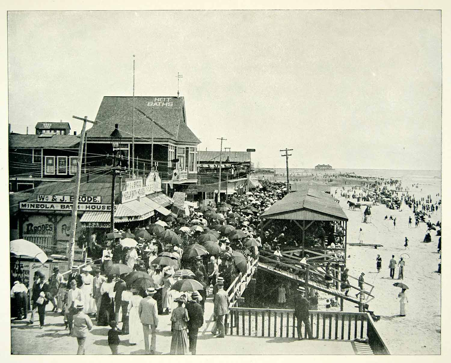 Keywords specific to this image: Historic, PA, America, United States, Shore, Sand, Umbrella, Tourism, Summer, Festival, Promenade, Hot Baths, Building, Mineola Bath House, Seaside