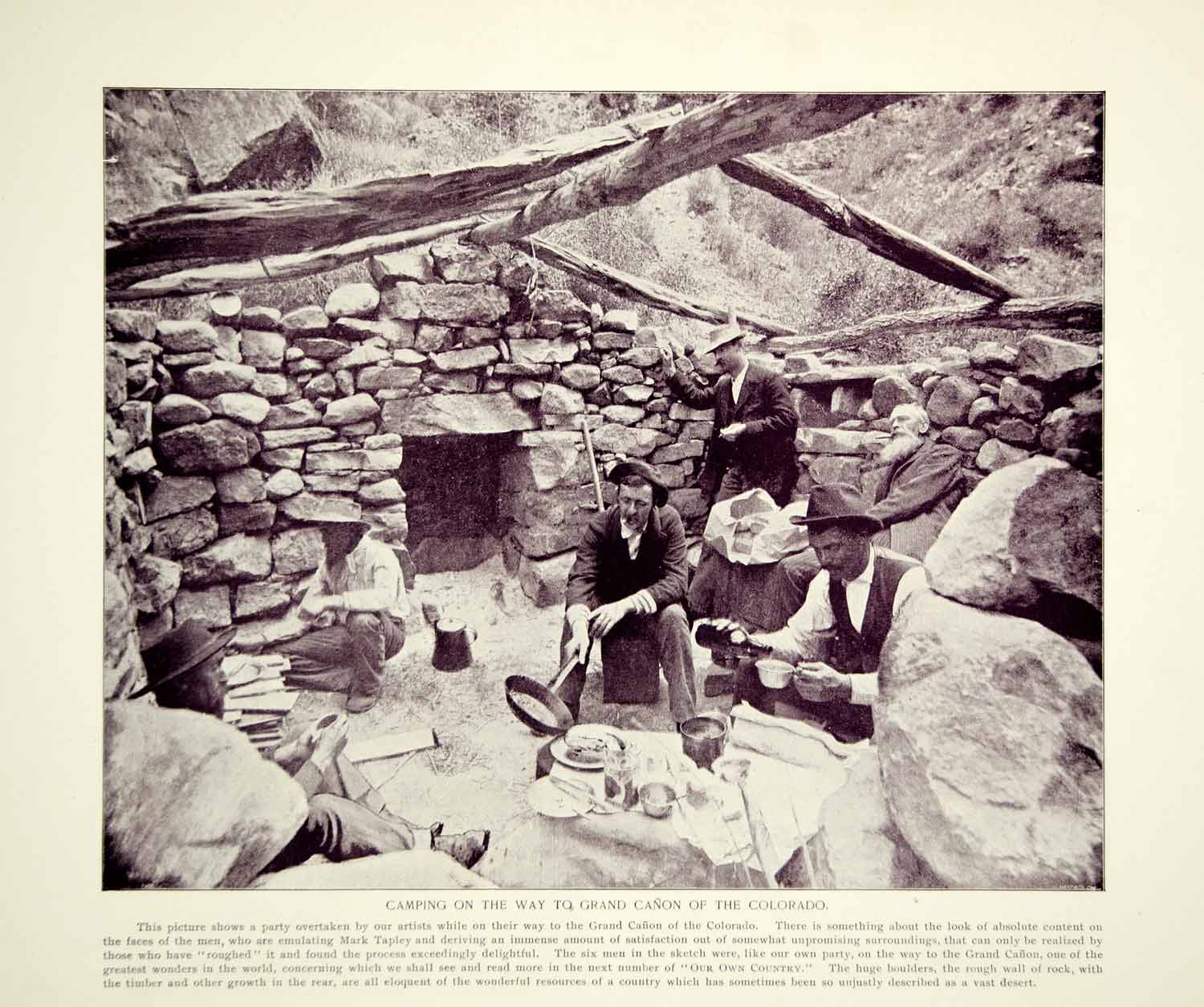 This is an original 1894 duotone halftone print showing a group of men stopping for a hot cooked meal on their way to the Grand Canyon.