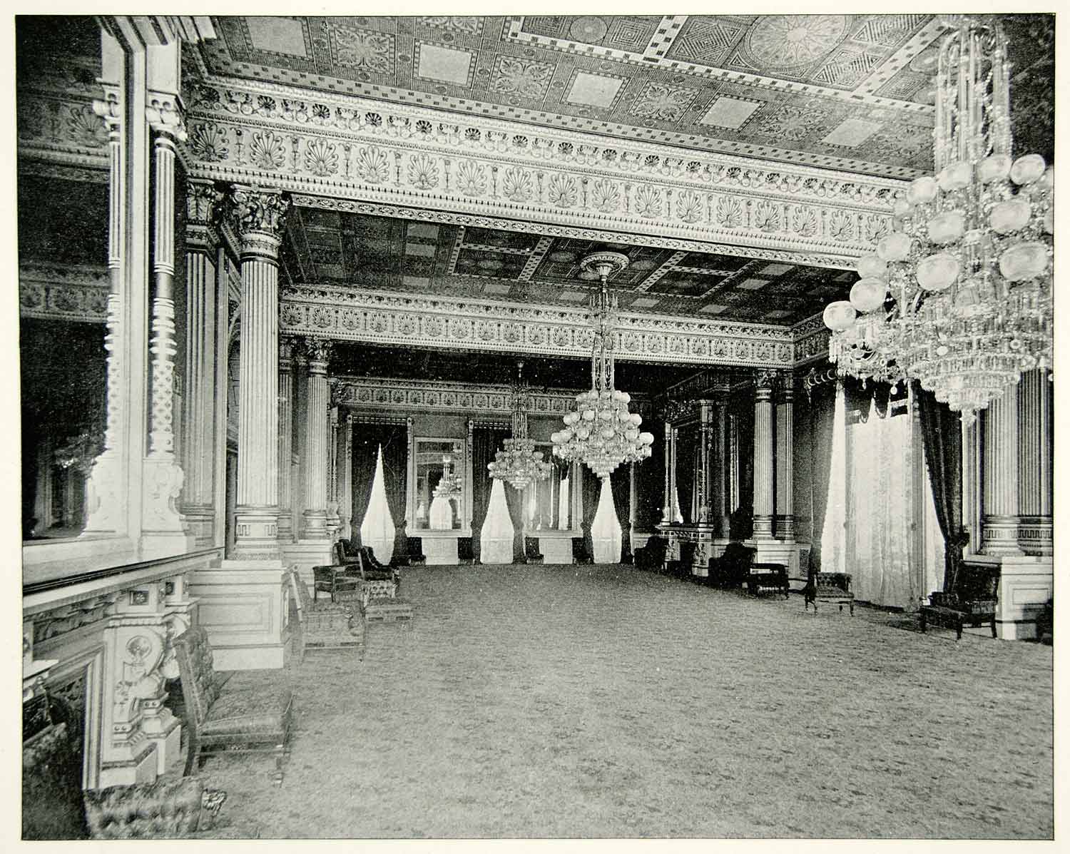 Keywords specific to this image: Presidential, United States, Government, Building, Bohemian Crystal Chandeliers, Drapery, Gilded Suite, Conference, Reception, Plaster, Frieze, Anthemion, Pattern, Corinthian Column, U.S., Furniture