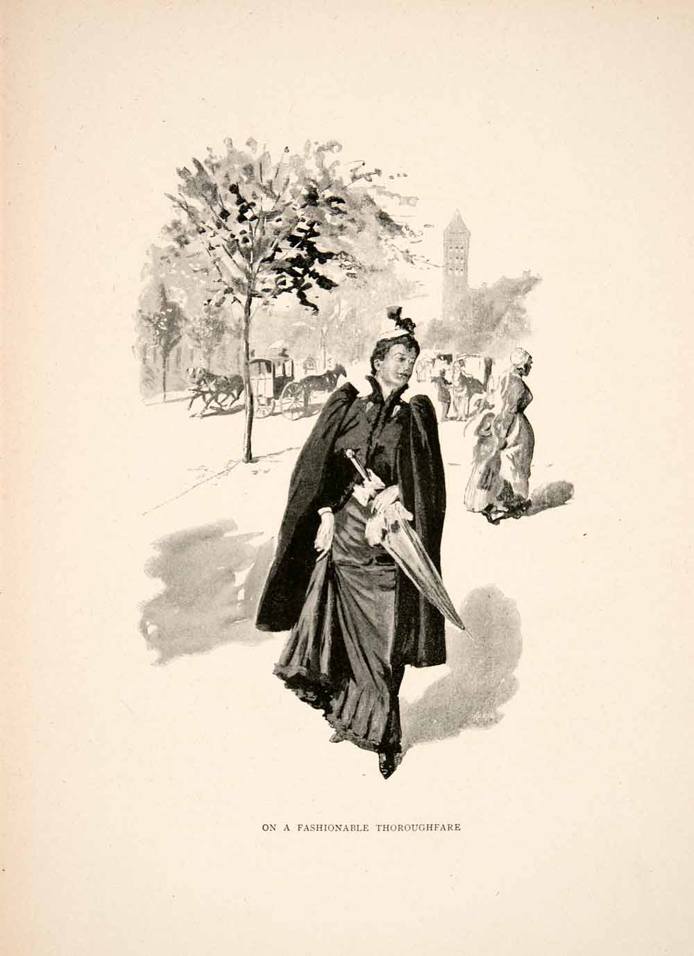 This is an original 1894 black and white halftone print of a woman walking down a "fashionable thoroughfare" in Washington D. C., capital of the United States of America.