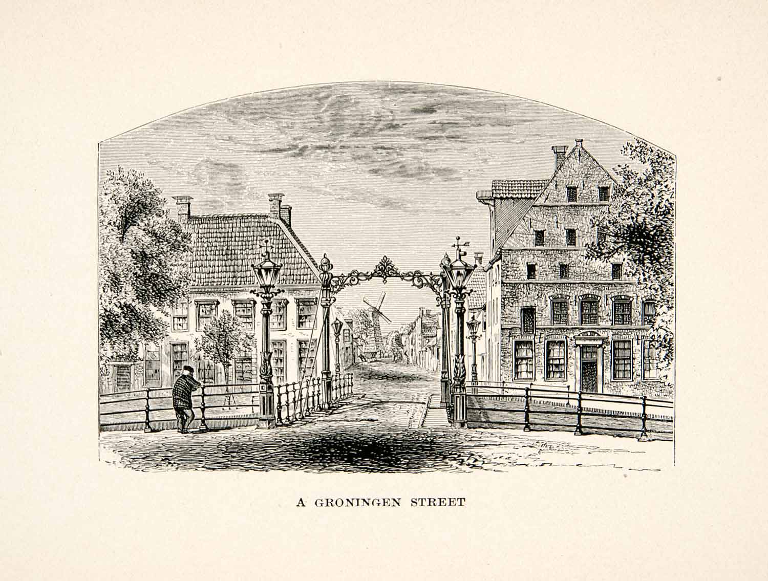 This is an original 1894 black and white relief line-block print of a street in Groningen, the Netherlands.