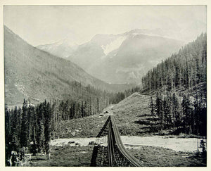 Keywords specific to this image: Railway, Transportation, Infrastructure, Scenery, Nature, Outdoors, Mountains, Wilderness, Terrain, Peak, Summit, Ridge, Locomotive, Train, Pine Forest