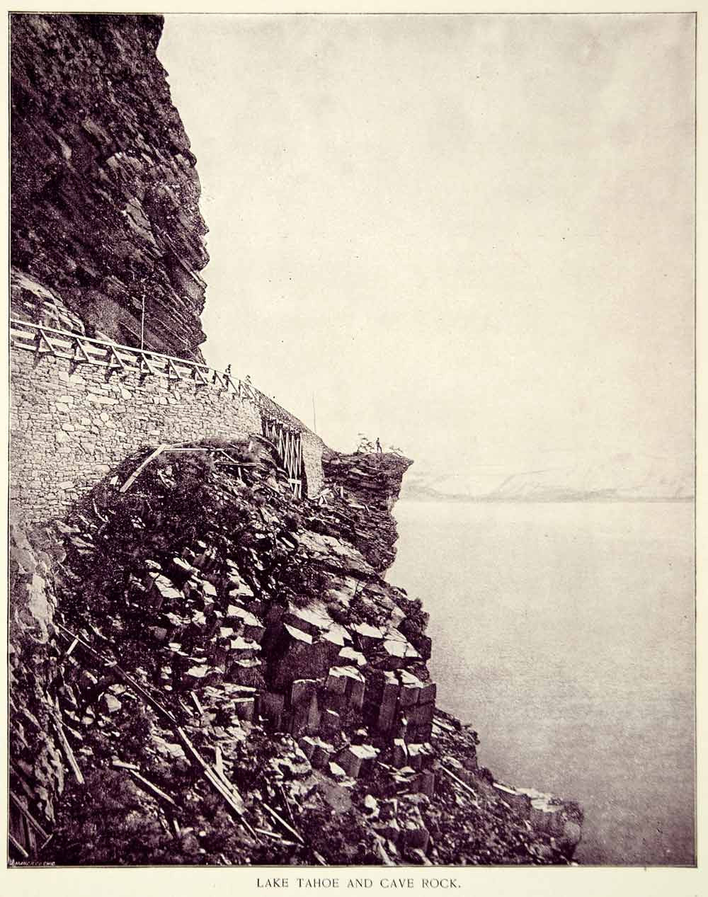 This is an original 1894 duotone halftone print of Lake Tahoe and Cave Rock in the Sierra Nevada.