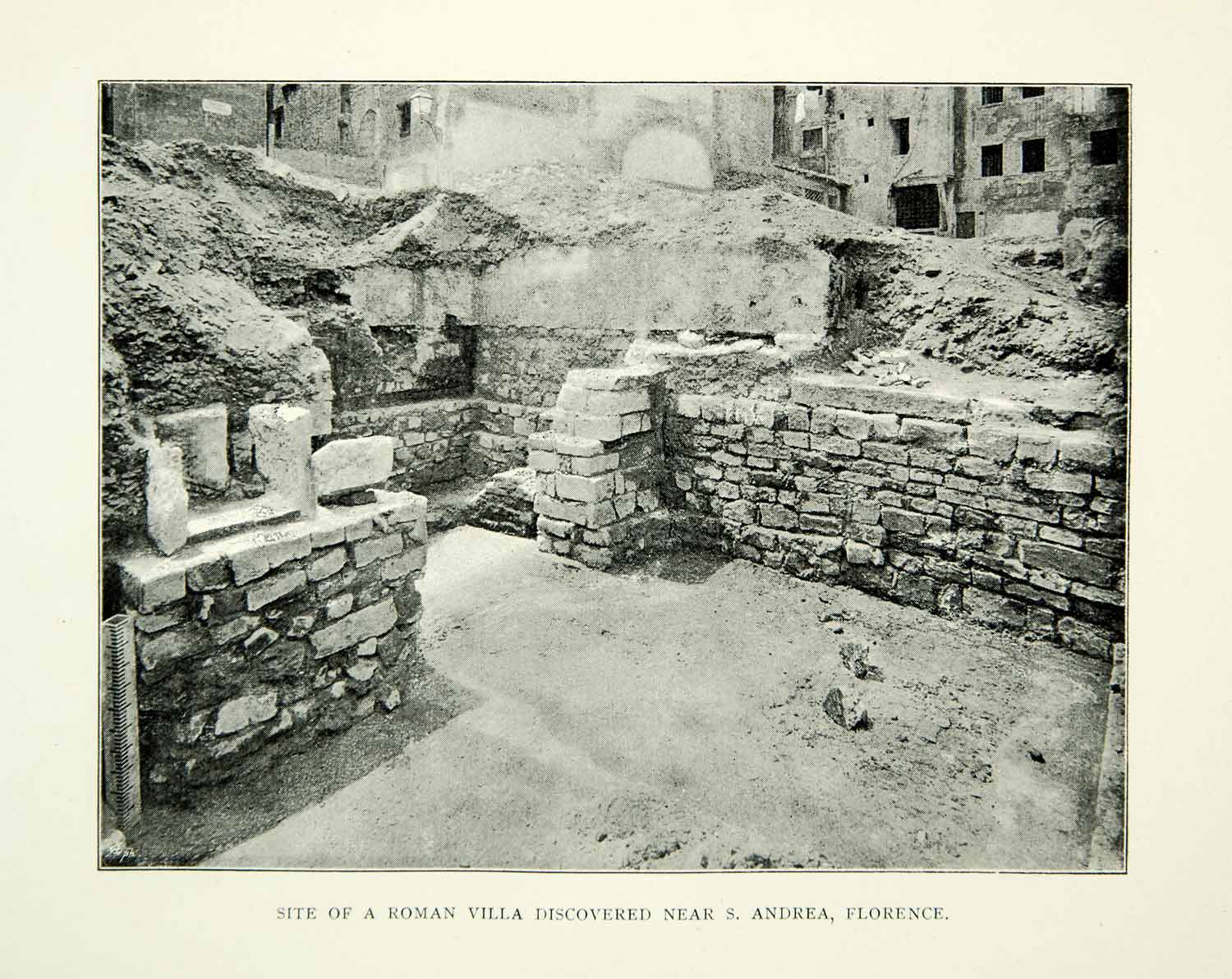 This is an original 1894 black and white halftone print of an archeological site dug up near San Andrea in Florence, Italy. It is thought to be the location of a Roman villa.