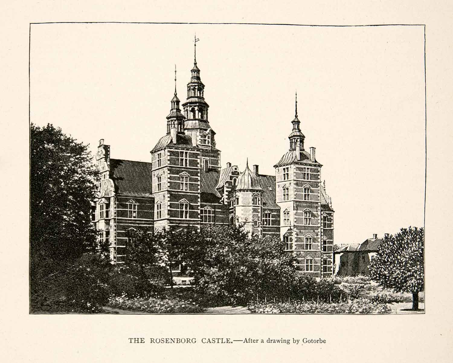 This is an original 1894 black and white halftone print of the Rosenborg Slot (Rosenborg Castle) in Copenhagen, Denmark.