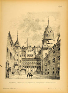 This is an original 1894 halftone print of an architectural sketch of the inner court of Schloss Detmold by O. Poetsch.